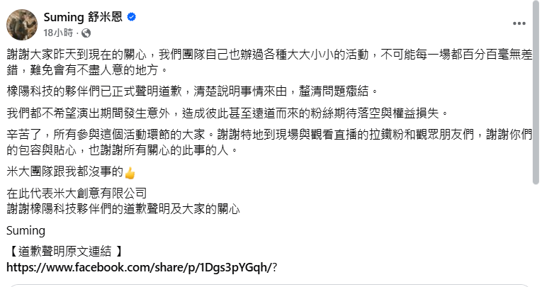 舒米恩事後在社群平台發文,表示對於突發狀況的歉意,並透露團隊正在消化這次意外。他寫道:「我們團隊自己也辦過各種大大小小的活動,不可能每一場都百分百毫無差錯,難免會有不盡人意的地方。」這樣坦率又溫暖的回應,讓粉絲感到既心疼又敬佩。