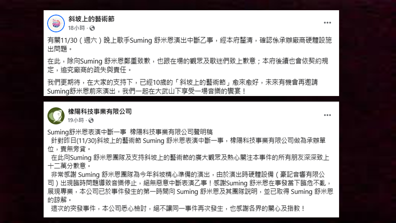 照片:翻攝 12/01 _kstyh_串文、斜坡上的藝術節臉書、橡陽科技事業有限公司臉書及聲明、Suming 舒米恩臉書