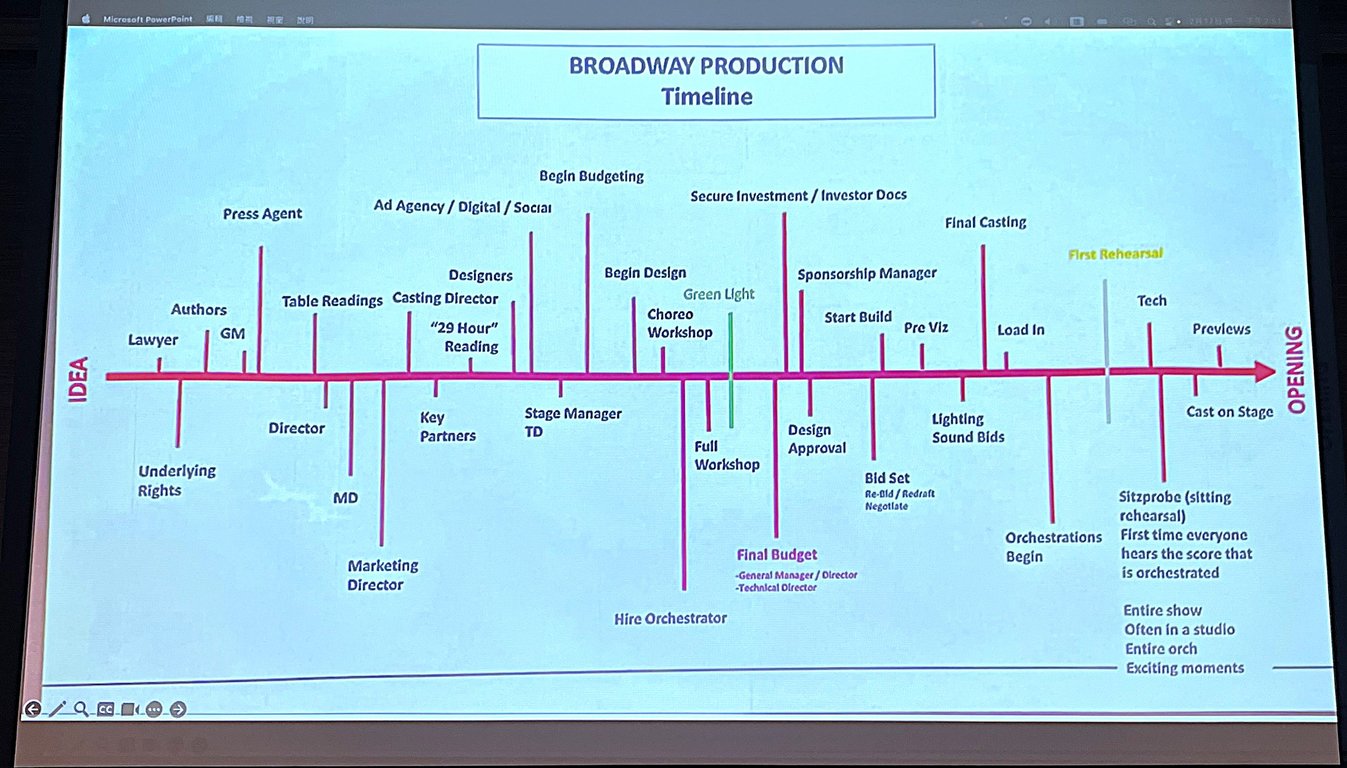 在百老匯製作線上,有明確的發展歷程。吸取了這次經驗,二人提到接下來如持續發展《勸世》的國際版,則需要回到讀劇階段、找適合的作者撰寫文本;除了跟進版權和轉譯改編,亦需要透過募資達至少4800萬台幣,才能完成試演(Try Out,即上圖的綠燈線)的所有階段。