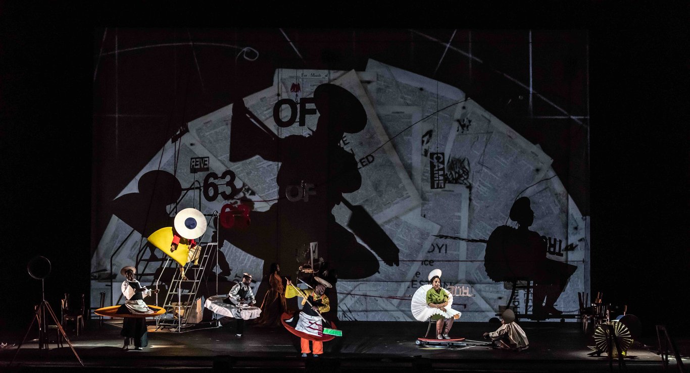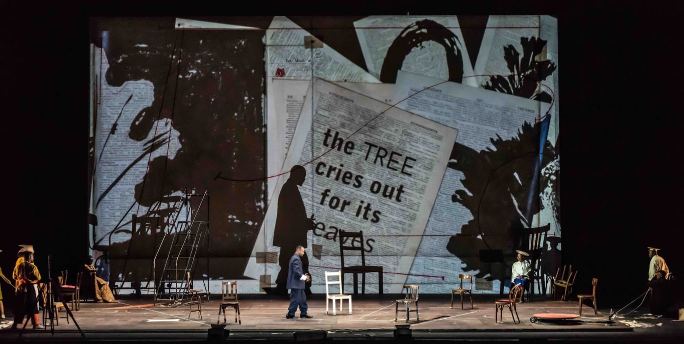 威廉·肯特里奇(William Kentridge)在《女先知》中,以投影、動畫和音樂探討「命運」與「選擇」。舞台上,旋轉的書頁象徵資訊的無序,而飛舞的樹葉則呼應古希臘西比拉女先知的預言方式——當預言被風吹散,人們便無法確定自己的命運。