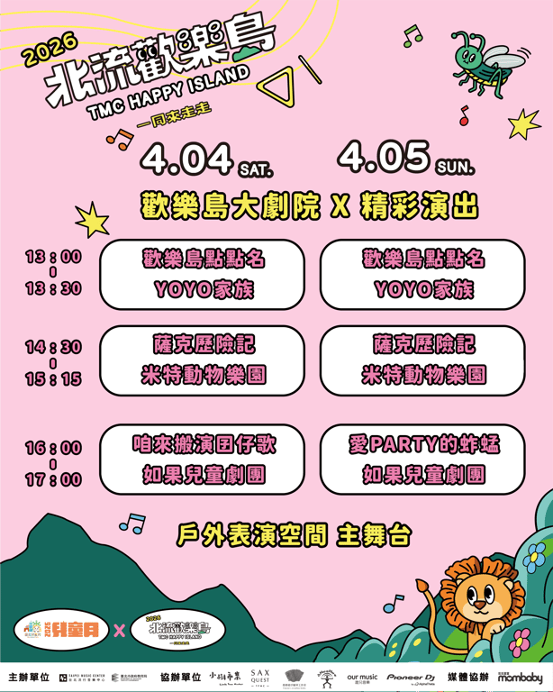 📅 4/4~4/5「北流歡樂島」戶外表演空間閃亮亮舞台,東森幼幼台哥哥姊姊還有米特動物樂園 登場,以及 如果兒童劇團《咱來搬演囝仔歌》、《愛PARTY的蚱蜢》,帶給大家充滿想像的親子音樂劇。