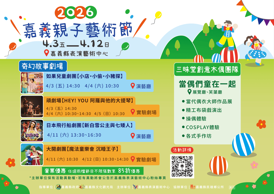 - 📅4/3~4/12 橫跨兩個週末,嘉義縣表演藝術中心 戶外有歡樂舞台,劇院內有奇幻故事劇場,任選兩檔「劇場」節目不限張數享85折優惠