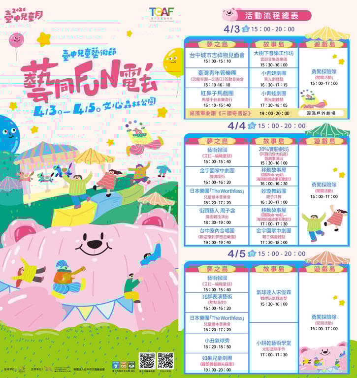 - 2026台中兒童藝術節 4/3~4/5 15:00~20:00 台中文心森林公園 表演都是免費自由入場!🔗