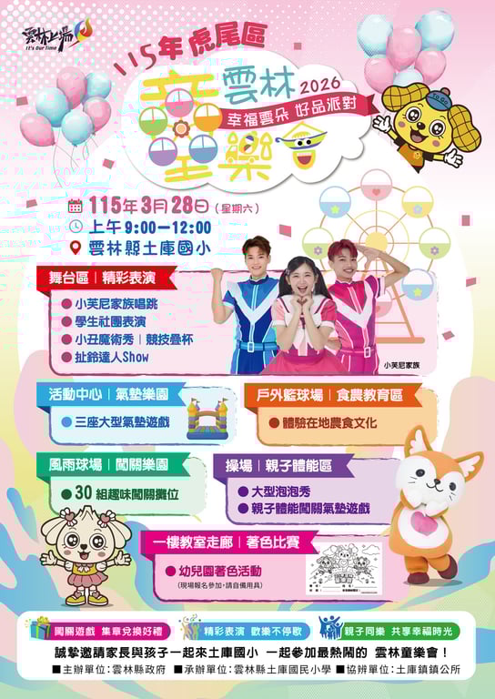 小芙尼家族唱跳、學生社團演出、小丑魔術秀、扯鈴達人、氣墊樂園、泡泡秀 × 親子互動遊戲、闖關樂園、食農教育體驗 - 3/28 09:00~12:00 雲林分區童樂會 各區活動資訊