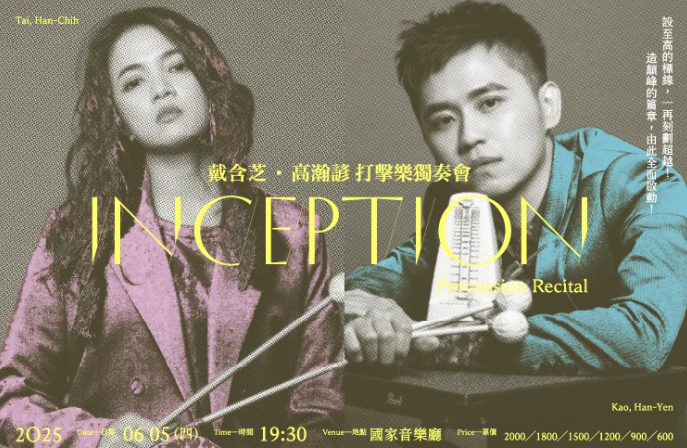 放眼全球擊樂界,臺灣在朱宗慶打擊樂團耕耘近 40 年下,不但於演出場次與內容水準已是世界第一,更成為人才培育的重要據點,由Z世代主導的 2025 年第一季音樂會《加乘效應:Zillennials & Zoomers》,更可以看出臺灣打擊樂人才的生生不息與無縫接棒。當中屬於第三代團員的戴含芝與高瀚諺,更要在 6 月 5 日首度於臺北國家音樂廳舉辦打擊樂獨奏會《Inception》,運用他們近三十年的擊樂學習經歷,展現邁向世界的前哨出擊!