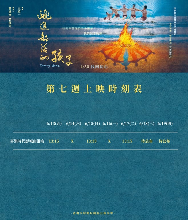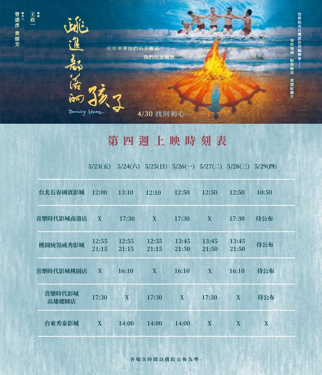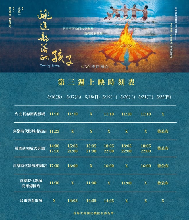 (5/15更新)《 跳進部落的孩子 》第三週電影院院線檔期:台北長春國賓、喜樂時代南港、桃園統領威秀、喜樂時代桃園、喜樂時代高雄總圖、台東秀泰影城,第三週 5/16 至 5/22 持續上映中!