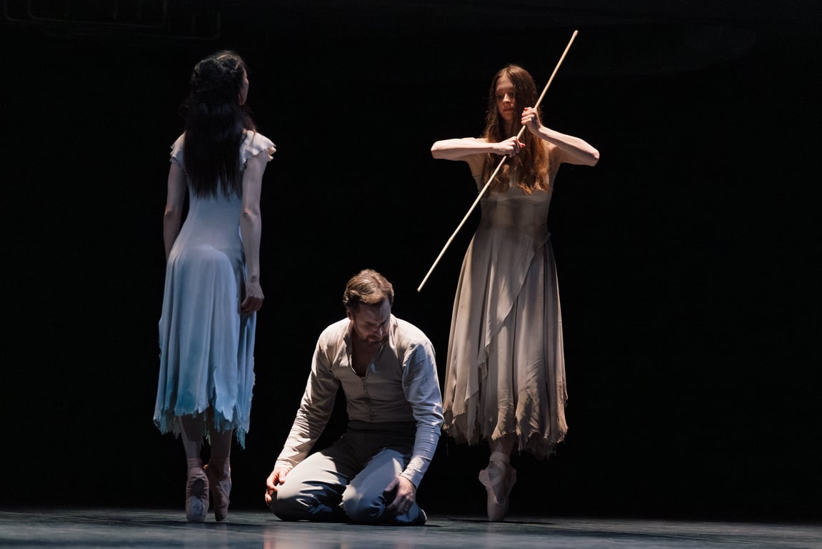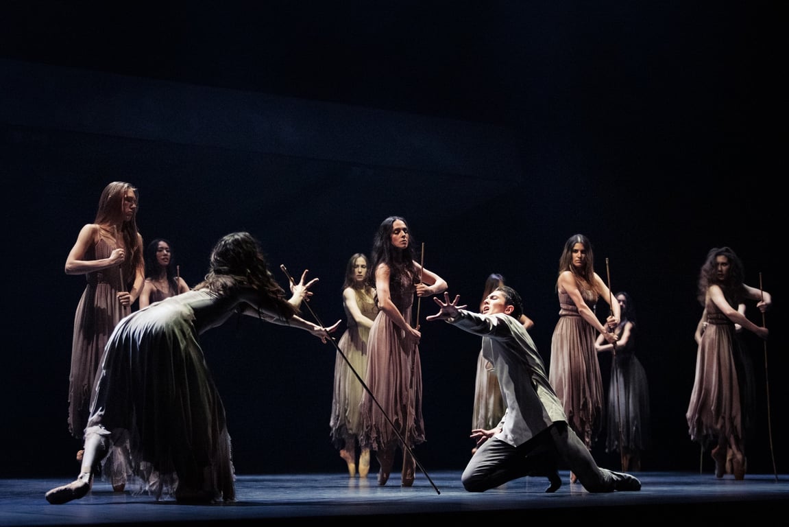 於是,第二幕開始,阿喀郎新版本中,女舞者們穿著硬鞋,沒有戴頭紗,手持細長竹竿。竹竿這項元素,對照了古典版的頭紗和花語。