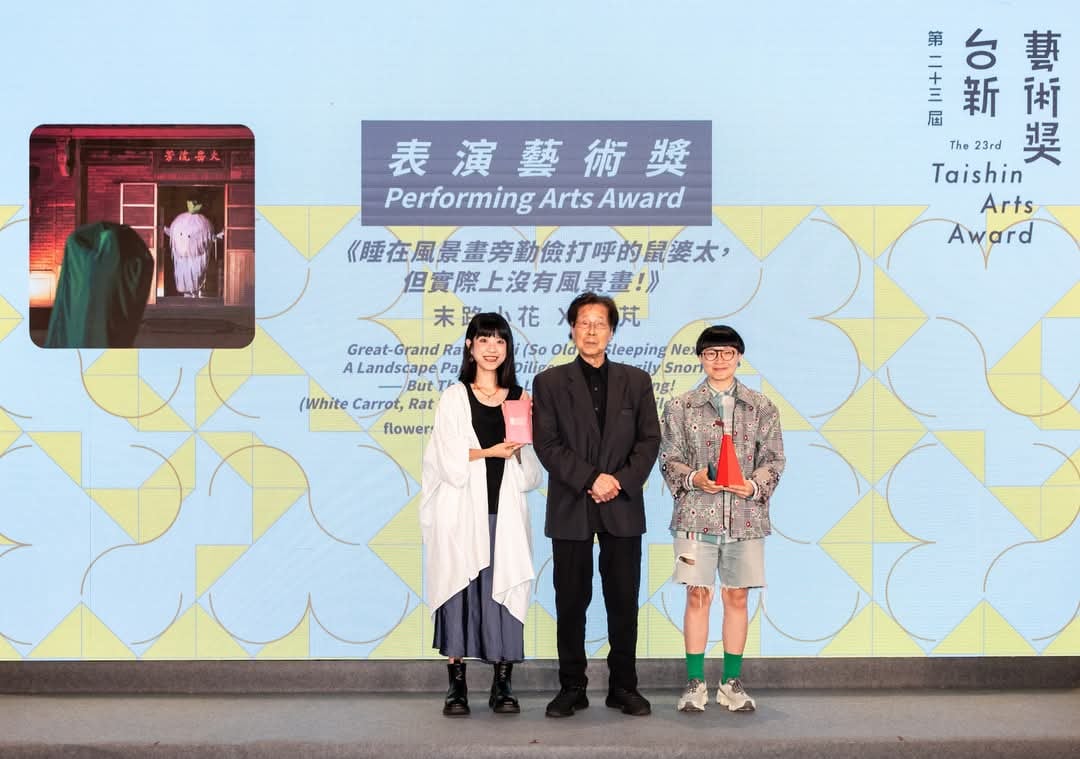 廢話不多說,第 23 屆台新藝術獎【表演藝術獎】由《睡在風景畫旁勤儉打呼的鼠婆太,但實際上沒有風景畫!(白蘿蔔、釘牙、她的雞、(以及她的後人))》末路小花 X 許芃奪得榮譽以及獎金 100 萬元。