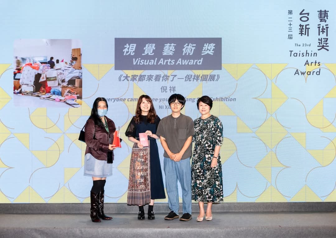 頒獎人:台新銀行文化藝術基金會 林曼麗董事(右)領獎代表:(左起)游靜蓉、董佳昀、馮志銘(倪祥今天因為工作坊的工作無法前來現場 由他展覽中的「長照者」代為領獎)|台新藝術獎提供