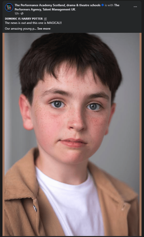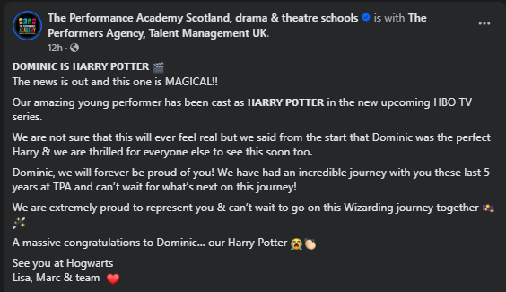 「消息終於公開了,這次的消息真是太神奇了!!我們了不起的年輕表演者被選為HBO即將推出的《哈利波特》影集中的哈利.波特。雖然這一切似乎仍然不真實,但從一開始我們就說Dominic是完美的哈利,現在終於能與全世界分享這個好消息,我們感到非常激動。Dominic,我們永遠為你感到驕傲!過去5年來,我們與你共同經歷了令人難以置信的旅程,無比期待接下來的冒險!我們非常驕傲能代表你,期待和你一同踏上這段魔法旅程。恭喜Dominic!我們的哈利.波特!」