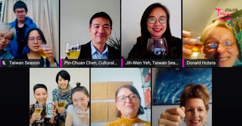 - (文化部2020愛丁堡藝穗節「臺灣季」論壇(上排左起)在臺團隊、駐英文化組陳斌全組長、製作人葉紀紋、主持人Donald_Hutera,與(下排)Infallible_Production總監、愛丁堡藝穗節與會者服務部主任於線上舉杯慶祝活動落幕)
