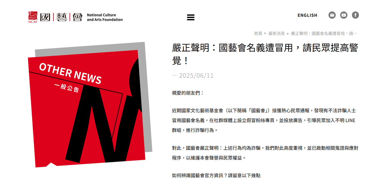 2025年6月11日,國藝會於官網公告「嚴正聲明:國藝會名義遭冒用,請民眾提高警覺!」