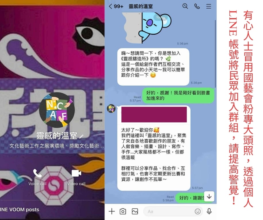 最近有一些嚴重誤解台灣藝文圈的詐騙集團異想天開,打算假冒「國家文化藝術基金會」(以下簡稱「國藝會」)行騙,還在社群媒體上設立假粉專、投放假廣告,甚至誘導無辜民眾加入 「靈感溫室」LINE 群組悄悄進行殺豬活動。