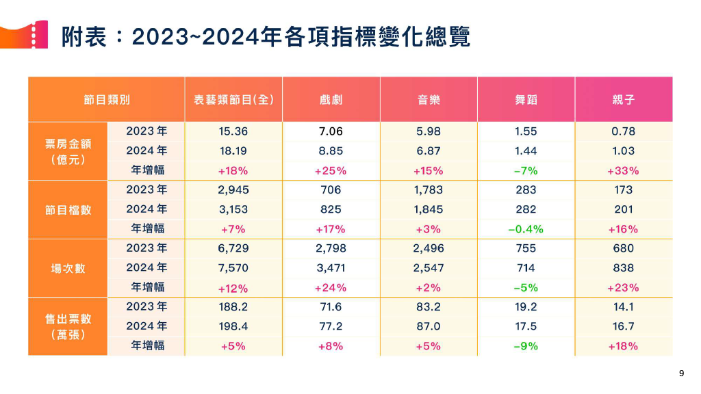 其他藝術類別檔數都是上揚又上揚,舞蹈類檔數幾乎沒變,售出票卷張數卻下滑多達 −9%。票房減少的直接原因是,有部分主辦單位開始打安全牌,「減量銷售」以控制成本/提升銷售利潤,避開虧損風險。