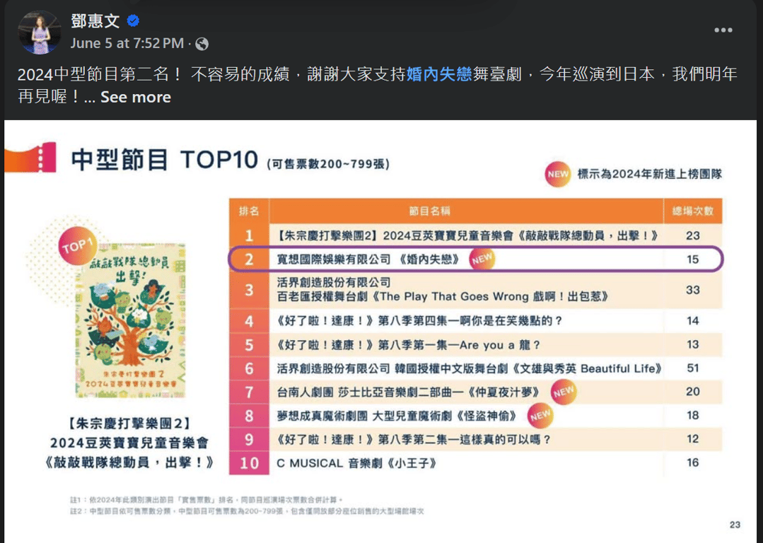 如果要比較觀眾消費端的需求,我們可以檢視票房吸引力。來看看中型節目排行榜的車頭燈,從鄧惠文醫師原著改編,吳維緯編劇執導的舞台劇版《婚內失戀》。