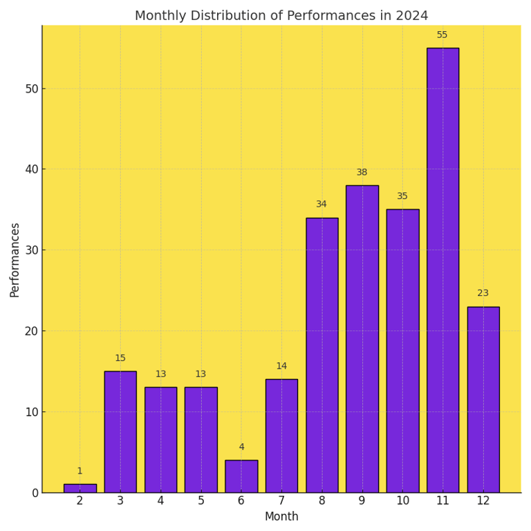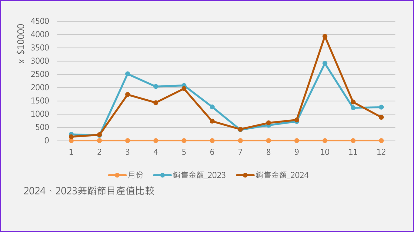 (圖 2024每月舞蹈節目場次變化。6月場次可能被索票演出稀釋,或場次資料尚不齊全)