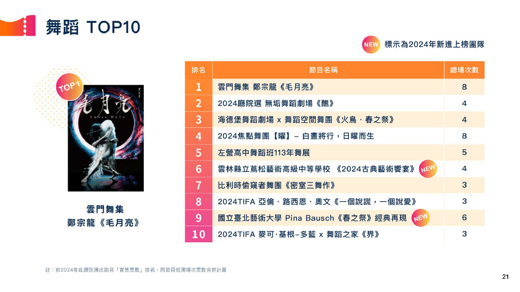 👉 TOP1「雲門舞集 鄭宗龍《毛月亮》」 8場大型場地 13,310席、票價中位數 $1,250、估計票房1千5到1千7百萬