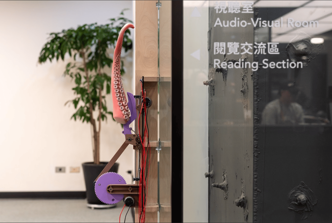 這樣的概念,也與圖書館外部正在進行的藝文廊道工程形成有趣的共鳴。工程的低頻噪音隱約傳入室內,與裝置敲擊聲交織成背景音場,形成一種「看不見但聽得見」的對位。無論是看得見卻無法接近,或聽得見卻無法視認,作品皆在不斷提醒觀眾:我們對空間的感知,其實遠比我們以為的更有限,也更主觀。
