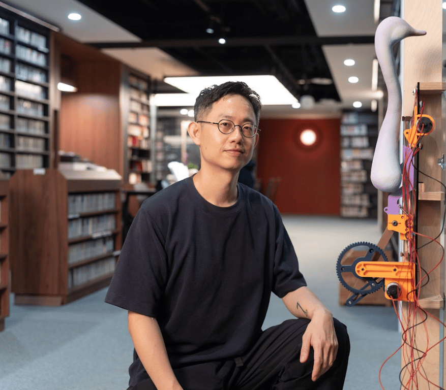談到這次在圖書館的創作,他說:「我對攪動空間的性格、挑戰其耐受的邊緣特別有興趣。所以我很興奮能夠在一個圖書館裡頭做一件與聲音有關、甚至是噪音的作品。」從這樣的語言,也能看出他對場域特質的敏感度與幽默感——以機械敲擊玻璃,在不打擾圖書館基本秩序的前提下,製造一種難以忽視的干擾性。