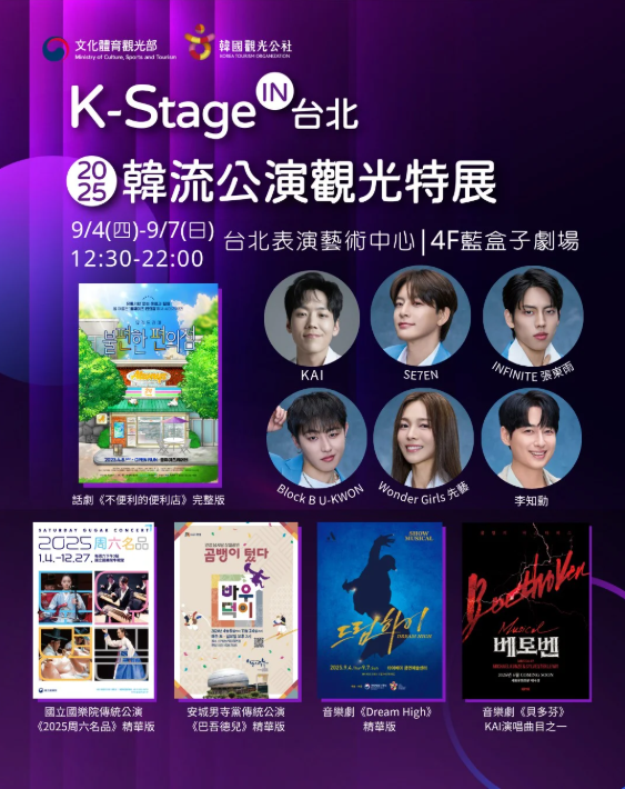 韓國文化體育觀光部韓國觀光公社主辦「 K-Stage in 台北|2025 韓流公演觀光特展」,於 9 月 4 日到 7 日,帶來音樂劇、傳統國樂演出等多樣化的表演藝術內容,還舉辦 KPOP 及韓國音樂劇體驗活動,讓台灣觀眾感受韓國表演藝術的魅力。