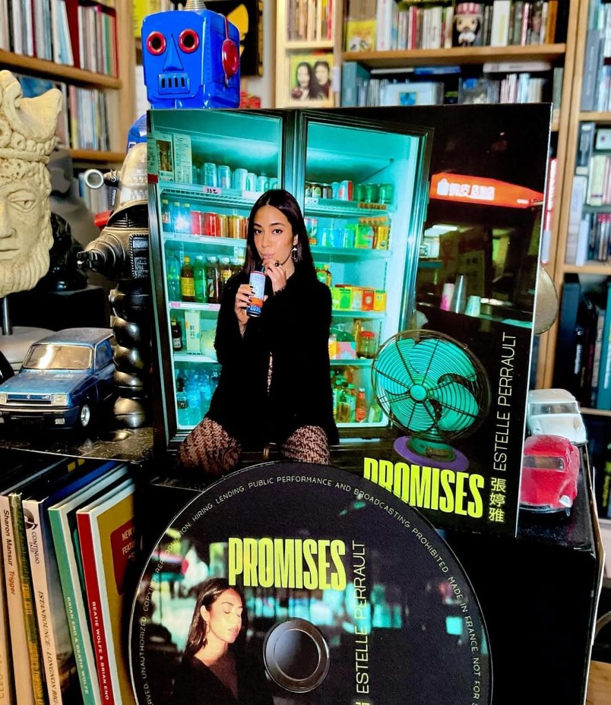 婷雅對台灣感情深厚,專輯《Promises》專輯主視覺融合了台灣元素——來自高雄鹽埕區菜市場的一間裁縫兼雜貨店,手上還拿著許多台灣人的童年回憶殺「蘆筍汁」! 圖/張婷雅 ig
