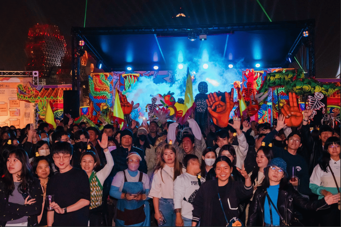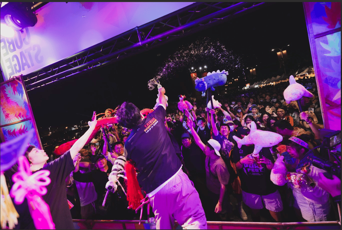 第一件法寶是音樂!隨著DJ響起,舞台瞬間化身舞池。士林女神領著爵士樂團與龍鳳神獸一同現身,以音樂與在地符號凝聚士林精神,讓派對氛圍全面升溫。