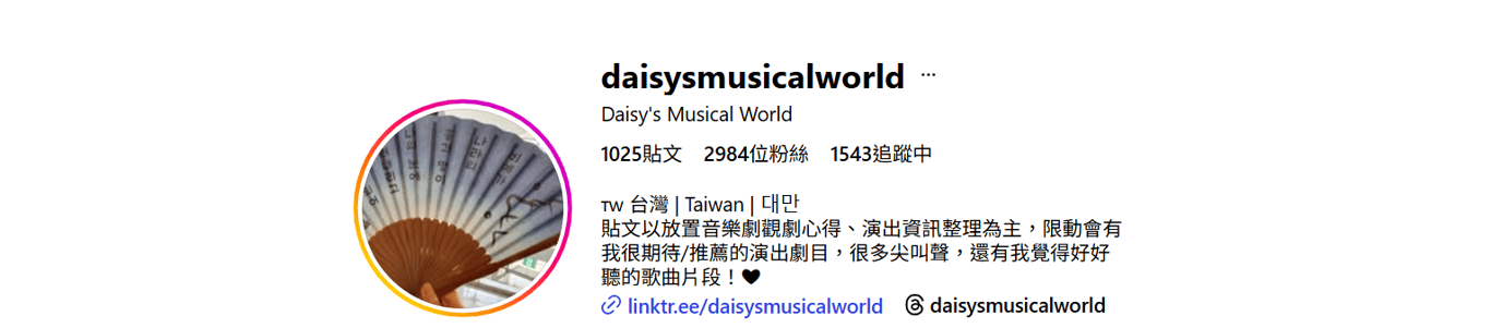 而主要由D小編(非D編)經營貼文的IG同名帳號,走的是影片及圖片路線,讓人一眼跟著去到劇院現場;也是不少戲迷追隨的開票指南,被粉絲稱為「可靠的觀劇情報站」。最好是同時追蹤FB及IG,立馬進入音樂劇的圈圈,像多了隨身更新的「音樂劇百科」,讓你的生活多了話題,也多了深度。