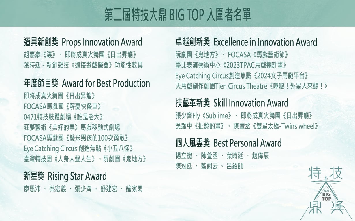 由 台灣特技舞蹈協會 主辦的第二屆「特技大鼎 BIGTOP 獎」正式公布入圍與得獎名單!