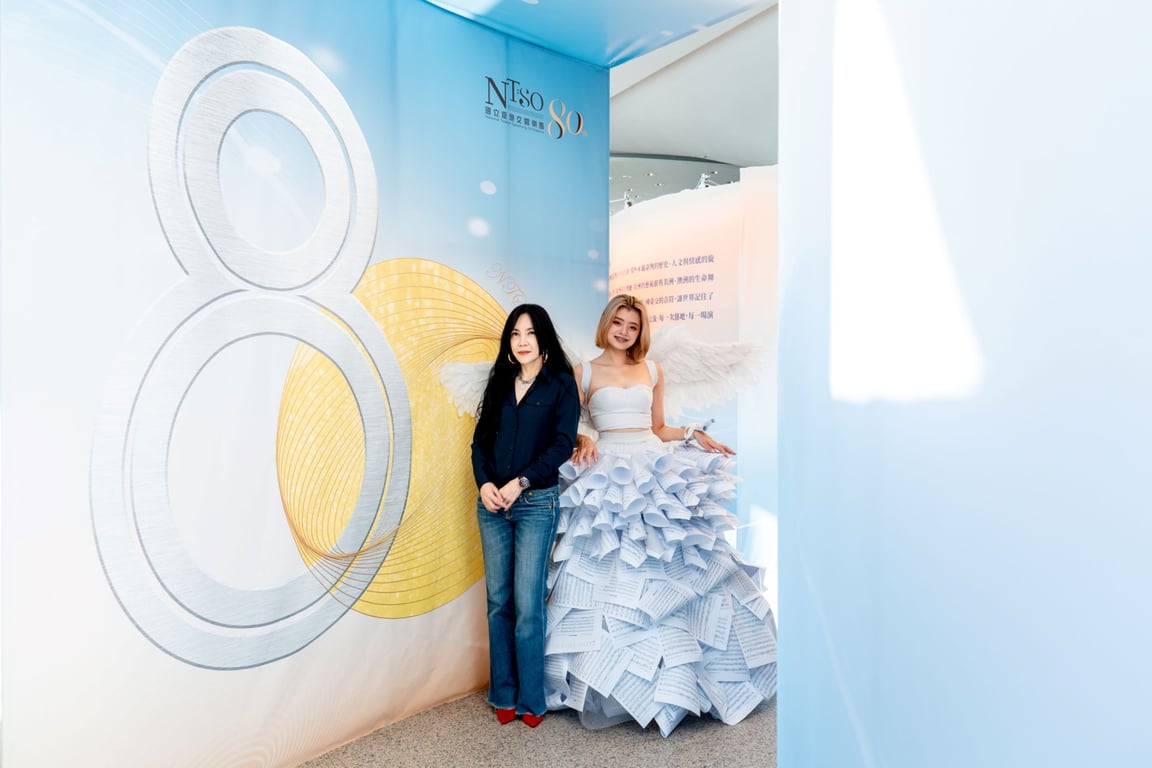 踏入歌劇院,展場以一襲由時尚設計師黃秀瑾以千張樂譜縫製而成的長擺禮服揭開序幕。層層堆疊的樂譜如波紋流動,胸前綻放的羽翼象徵臺灣之聲飛向世界,成為展覽最受矚目的拍照亮點。這件作品不僅是一襲禮服,更是一座以視覺語彙凝聚國臺交80年能量的「音樂雕塑」。