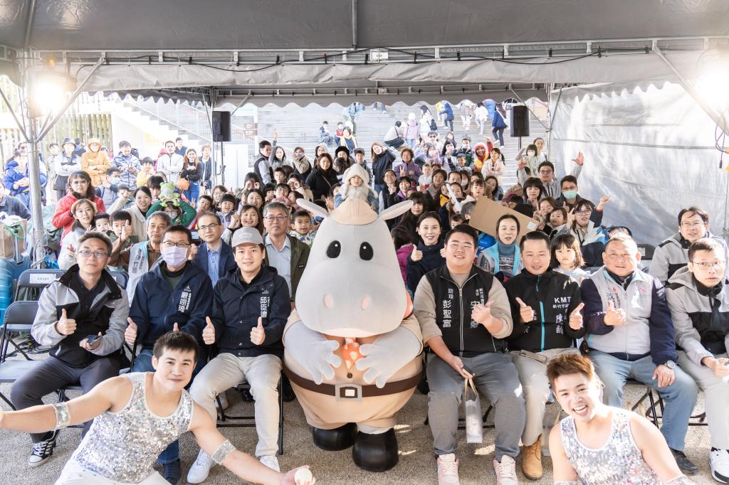 ▲新竹市立動物園今(12/14)歡慶89歲生日快樂,代理市長邱臣遠和全體與會貴賓及大小朋友們合影。(圖/竹市府提供)