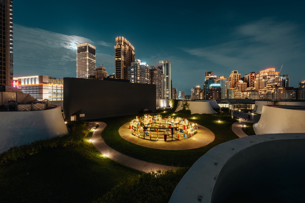 臺中國家歌劇院指出,《綠動樂園》以永續理念為核心,直徑12公尺的圓形迷宮,由可完全回收的鐵管與木箱堆疊構成;3小徑以自然迴旋方式設計,搭配不同高度的層架,讓全齡參觀者都能自由探索。