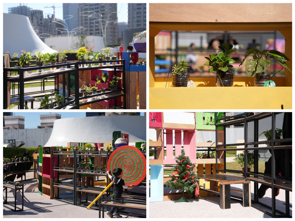 《綠動樂園》的植栽容器由館內回收的寶特瓶再製,迷宮內的休憩長凳是汰換下的劇場舞台木地板,由同仁設計、並親手於歌劇院佈景工廠打造而成;希望透過創意設計與環保材料的結合,把藝術與永續理念融入你我日常生活空間中,並營造出既友善又具趣味性的環境氛圍。