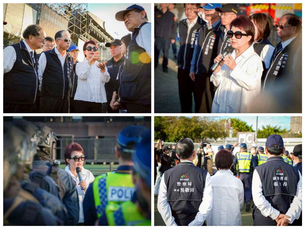盧秀燕也向現場警消同仁精神喊話,強調臺中為全國第2大城市,近期大型活動密集,維安任務相對繁重,感謝第一線人員的辛勞與付出。她說,市府自北捷事件後即啟動第一階段維安控管,並針對跨年及後續多場大型活動持續檢討與強化部署。