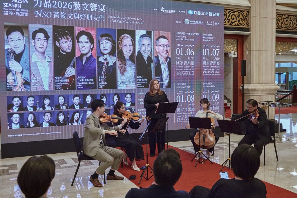 記者會現場演出片段(自左到右)小提琴家林品任、NSO 小提琴家曾婕安、次女高音珍妮佛‧詹森‧卡諾、NSO 大提琴家唐鶯綺、NSO 中提琴家陳猶白