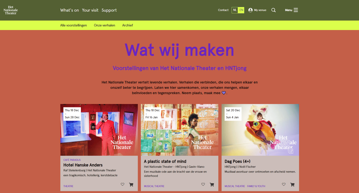 HNT 的節目策畫分成幾個系列,De Vroedt 主要負責自製成年觀眾的劇場作品,同時邀請荷蘭各地眾多的劇團來客座演出。國家劇院還另外製作兒童、青少年劇場。