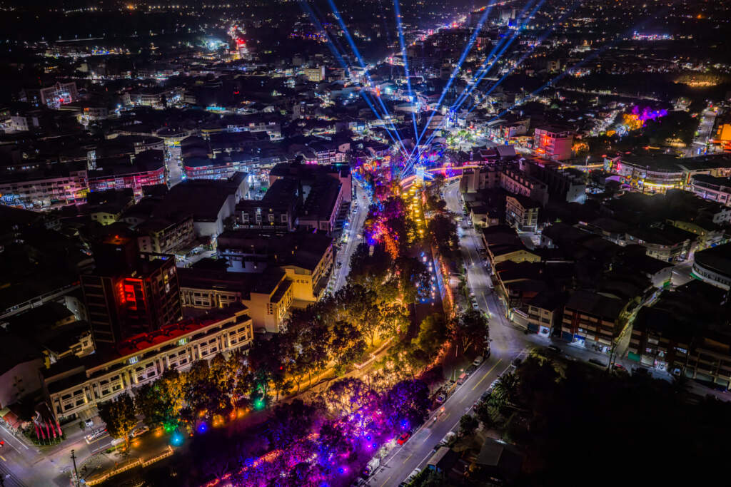 ▲2026萬年燈區-龍頸溪空拍。(圖/屏縣府傳播處)燈節期間除燈光展演外,開幕夜將推出大型自製舞台劇《屏東流》,並於春節期間安排馬戲與表演活動。縣府同步規劃免費接駁車與春節加碼雙層巴士,鼓勵民眾搭乘大眾運輸賞燈。更多資訊可至「2026屏東燈節」官方平台查詢。