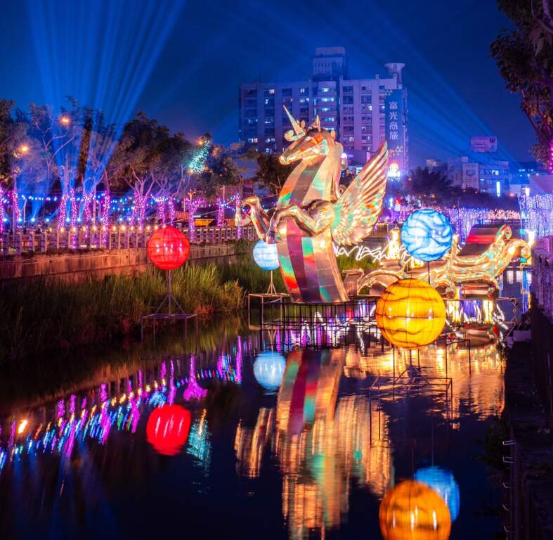 ▲2026萬年燈區-主燈-騰光。(圖/屏縣府傳播處)萬年溪燈區以「光馳萬年」為主題,沿溪畔延伸至萬倉街台鐵橋下廊道,設置9組燈飾。主燈「騰光」以駿馬躍出水面的動態意象呈現,每30分鐘展演燈光秀,為溪畔夜景注入生命力。