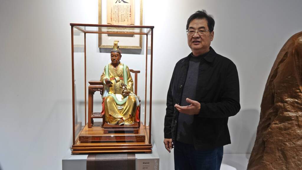 ▲展出作品內容相當多元,其中也包含備受關注的經典作品,如曾為臺南下營九龍太子宮所雕刻、曾遭竊後尋回的神像。(圖/記者林明佑攝)出生於臺南的陳啟村,自1988年榮獲南美展首獎以來,陸續獲得第一屆奇美藝術獎、府城獎等多項重要肯定。除個人創作成就卓著外,他亦長期投入藝術推廣與傳承工作,與多所大學合作,將木工藝結合108課綱,發展高中職教學教案,建立系統性的傳習機制。陳啟村並曾擔任「府城傳統藝術學會」、「臺灣工藝之家協會」、「臺南美術研究會」等藝術團體理事長,並於2022年出任「臺灣工藝聯盟總會」總會長,積極促進臺灣工藝、傳統文化與跨領域藝術的交流發展。