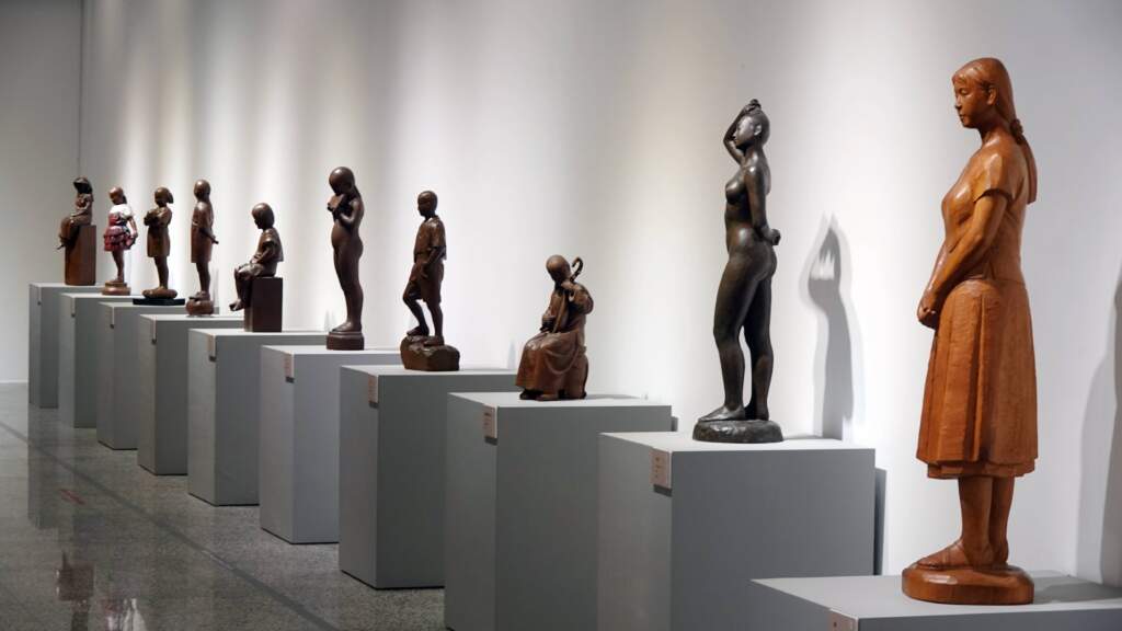 ▲「藝啟彰華—人間國寶陳啟村藝術特展」展場一隅。(圖/記者林明佑攝)陳啟村木雕藝術的最大特色,在於「中西融會」的美學風格。他以傳統福州派粧佛藝術為根基,熟稔漆藝與粉線裝飾技法,同時吸收西方素描與現代雕塑的藝術養分。雖然木雕屬於「減法」創作,但他透過多元學習拓展視野,以精準刀工刻劃人物神韻與姿態,並以「加法學習」突破傳統框架,強調作品不僅展現技法,更蘊含生命力與藝術美感。