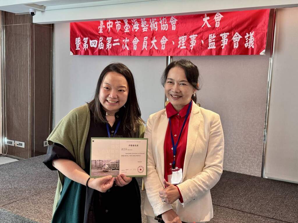 ▲藝術家張若綺(左)獲頒倫敦首屆白點藝術國際展評審委員提名獎,開心與廖迎晰理事長合影。墨海藝術協會於1月17日在台中市金典酒店召開第四屆第二次會員大會,去年5月帶領10餘位藝術家赴倫敦參展的廖迎晰理事長,會中轉頒白點藝術國際展獎項,包括獲得優秀作品獎的4位藝術家顧文華、徐兆慧、黃秋月、鄭皓仁,以及得到評審委員提名獎的張若綺。廖迎晰理事長開心的說,這是大家共同努力合作的成果。