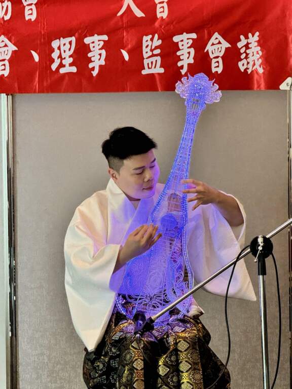 ▲墨海會員大會在琵琶王子黃俊豪演奏動聽樂曲中揭開序幕。墨海會員大會,由琵琶王子黃俊豪演奏〈春江花月夜〉、〈櫻花〉、日本和風組曲及新疆維吾爾族民歌等動聽樂曲揭開序幕,藝術家張秉宏亦帶來精彩的薩克斯風演奏,除音樂演出外,並有KTV歌唱、慶生、交換禮物及現金摸彩等娛樂節目。著名雕塑家洪易、東碩畫會理事長邱泰洋、東海大學台中市校友會理事長邱于珊及副理事長陳秀枝、中港澄清醫院神經內科主任葉守正醫師、眾望愛心基金會理事長及立人高中校友會會長廖俊傑等貴賓到場共襄盛舉。