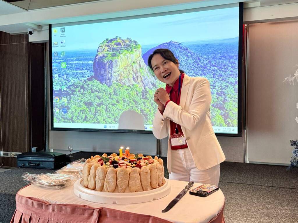 ▲廖迎晰理事長開心跟大家一起過生日,感動的切下大蛋糕與眾人分享。至於廖迎晰理事長個人2025在國際展的表現更是精彩,除參與倫敦白點藝術國際展外,同時在倫敦千禧畫廊辦理個展結束後,特地帶著心愛的粉紅色雕塑作品〈重返地球〉,巡迴倫敦市區各大景點快閃打卡,進行別開生面的無聲行動,在當地轟動一時。此外;她在2025台北國際藝術博覽會推出的《演化的寓言》個展,亦備受好評。東海大學美術研究所第52屆畢業的廖迎晰,亦因此膺選2025東海大學全國校友楷模,可說實至名歸。