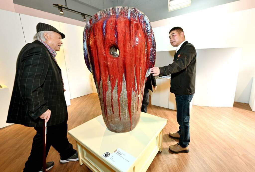 ▲苗栗縣長欣賞李茂宗「鴻運當頭」作品。現年85歲的李茂宗,是公館鄉客家子弟,32歲即以中華民國首位榮獲國際陶藝金獎之姿赴美,定居在紐約蘇荷區,相當活耀於國際陶藝舞台。李茂宗堅持以苗栗土為媒介,長年深耕陶藝創作與教育推廣,並致力於推動臺灣陶藝由傳統工藝邁向當代藝術的發展,2024年榮獲苗栗縣政府頒發「臺灣陶藝薪傳成就獎」。