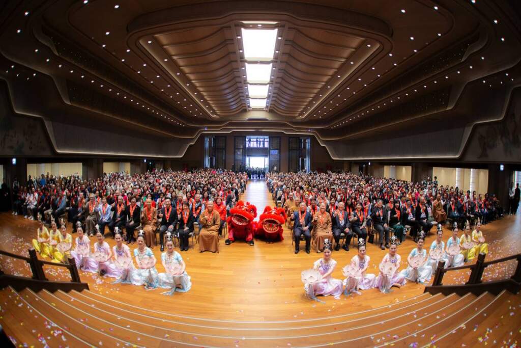 ▲首展「星雲大師一筆字書法」登場。各地雲集而來的嘉賓,讓這場中部地區藝文盛事增添光彩,佛光山住持心保和尚、台中市長盧秀燕、立法院副院長江啟臣、中華民國博物館學會理事長曁國立歷史博物館館長洪世佑親臨致詞祝賀。逾千位與會人士齊聚3樓大殿,見證歷史一刻。熱鬧的祥獅獻瑞及喧天的鑼鼓慶賀新館啟用,人間大學老師翁麗蓉帶領雅筑箏樂團,以悠揚琴音供養大眾,鄭秀真老師指導的佛光敦煌舞團,則以「香雲花雨.千手伎樂」獻上祝福。