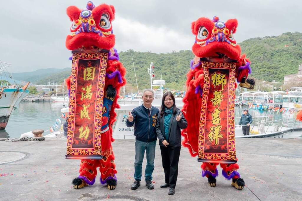 ▲活動結合舞獅表演及傳統「擲福」習俗。新造公務船命名為「東北角五福」,寓意「五福臨門」,象徵平安、健康、順遂與守護。東北角管理處表示,「五福」除代表管理處第5艘公務船外,也取管理處所在地「福隆」之「福」字諧音,並與臺語「有福」相呼應,期盼新船承載海洋守護使命,為東北角海域帶來更多平安與福氣。