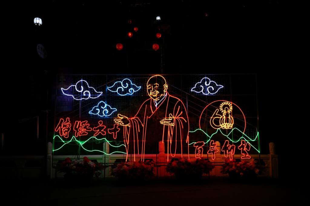 夜空中的600架無人機燈光秀,更是吸引許多年輕人專程前來拍照。無人機在夜空排出佛教意象與吉祥圖案,結合音樂與法會燈光,讓人驚嘆科技也能傳遞心靈感動。