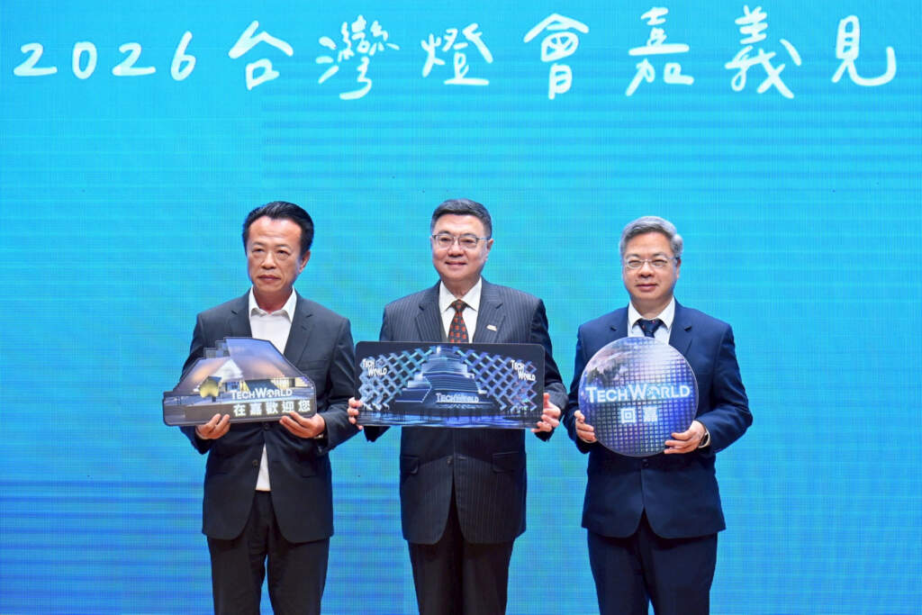 ▲2026台灣燈會TECH WORLD館記者會,左起嘉義縣長翁章梁、行政院長卓榮泰、經濟部長龔明鑫。