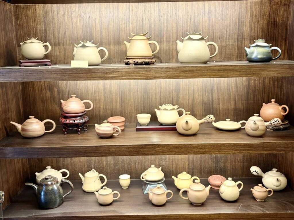 ▲「台灣工藝之家」周美智磐創作陶坊新闢展覽空間,邀民眾體驗陶藝與社區文化之美。(圖/記者蘇彩娥攝)周美智的創作特色以茶壺聞名,作品多採拉坯成形,胚體薄而輕盈,線條流暢且富有韻律感,展現細膩柔和、帶有女性特質的造型美感。她在創作中融入台南在地元素,將廟宇造型、吉祥圖騰轉化為壺身裝飾,使茶壺不僅是器物,更承載地方文化意象。因應自身左手操作習慣,她亦特別為左手使用者設計專屬茶壺,在握把角度、出水流暢度與實用性上反覆調整,體現工藝家對細節的極致追求。