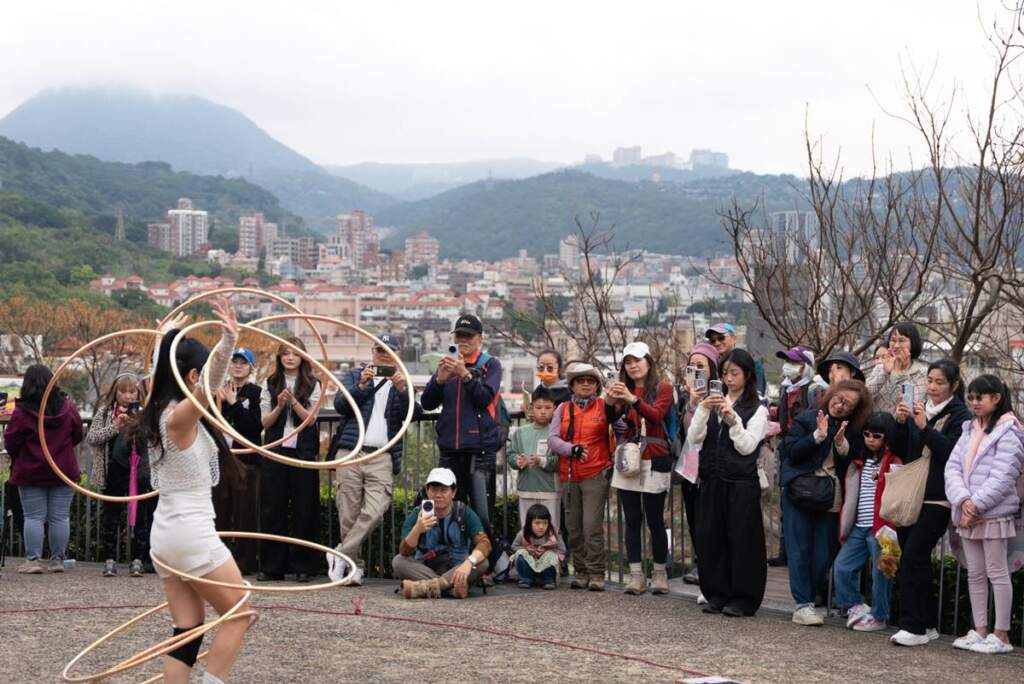 ▲特技舞蹈呼拉圈「圈動奇蹟」配合花季活動,以「花の一生」為主題帶來精美表演。今年的三層崎花海不同於一般花展,以「全日表演、全場活躍、全民共創」的精神,將開幕活動擴大舉辦為「園遊日」,邀請全民同樂,歡慶春日到來。開幕日首先由北投當地歷史悠久的臺北市石牌國中管樂團帶來充滿春季風貌的演出拉開序幕,並接由特技花式呼拉圈、日本舞踊的表演延續精彩,現場音樂、舞蹈不斷電,充滿歡快的氣氛。現場亦邀請人體彩繪藝術家即席創作,將花朵描繪於肌膚之上,讓人彷彿走進花海,成為風景的一部分;花彩調色盤:寫生比賽同步展開,畫筆、色彩與花海交會,讓賞花不只是欣賞,更成為一場全民參與的藝術體驗。