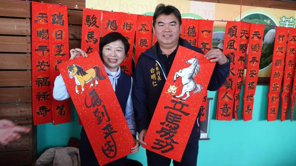 ▲花壇鄉農會總幹事顧碧琪、議員陳銌銌服務團隊副執行長白明仁一同祝福民眾新的一年馬到成功、馬上幸福、馬上發財。(圖/記者林明佑攝)今年活動特別以「龍馬精神、馬到成功」為主題,除了準備多款馬年吉祥話春聯供民眾選取,更首度加入豐富繽紛的「彩色年畫」,為傳統年節增添視覺亮點。活動現場邀請多位書法老師與學員親自揮毫,為鄉親客製化專屬的春聯,讓大家帶回滿滿的年味與祝福 。